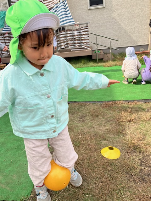 5歳児『なかよしサーキット』の一部。ボールを足に挟んで進みます♪