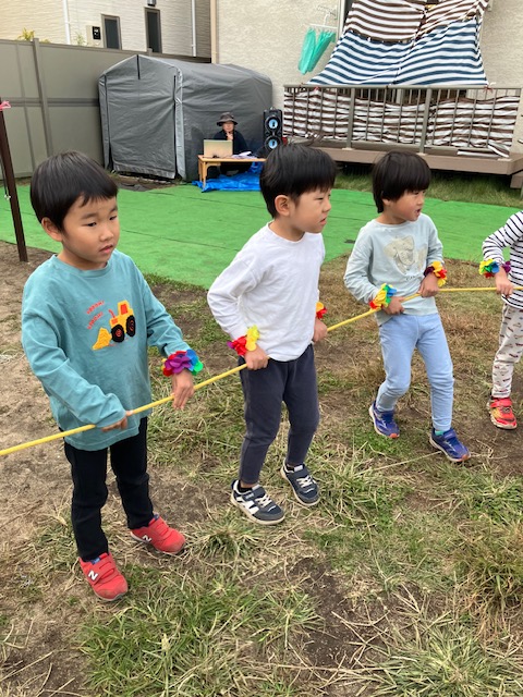 4歳児ダンス『ポポポポポーズ』今日はパラバルーンを縄跳びで代用しました。